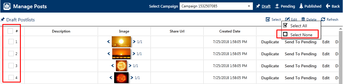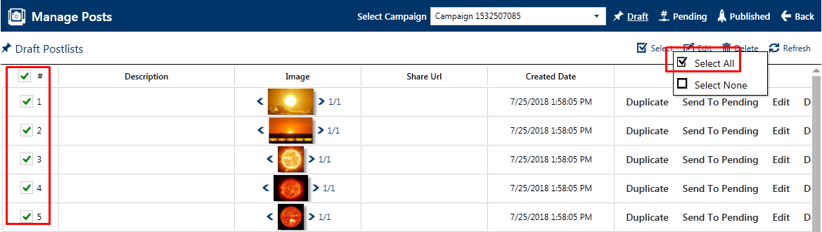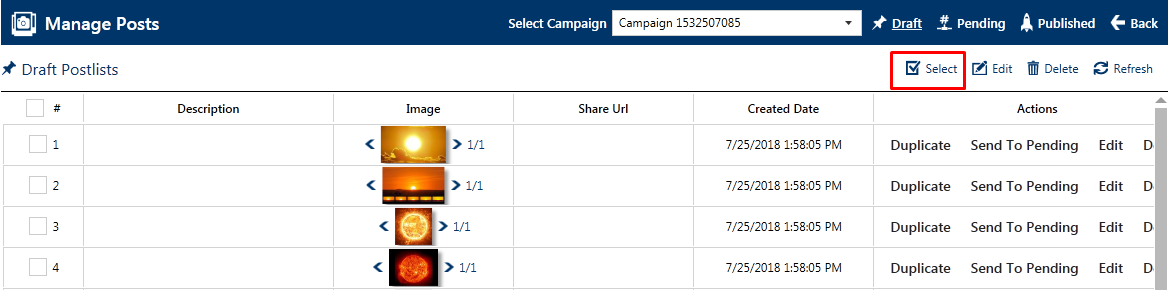 - Select :- If this button is clicked, Socinator will select or deselect the posts which are present over Draft, Pending or Published post lists.